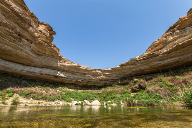 Озеро Саура находится в прибрежной части Каспия. Водоем "прячется" в каньоне полуострова Мангышлак, словно полусфера, с трех сторон он окружен отвесными каменными стенами. Он выглядит как половинка большой чаши высотой около 50 метров. По одной из версий, название озера Саура переводится как "теплое место у вымени кормящей кобылицы". Другое название водоема - Черепашье озеро, ведь здесь уже давно обитают пресноводные черепахи.