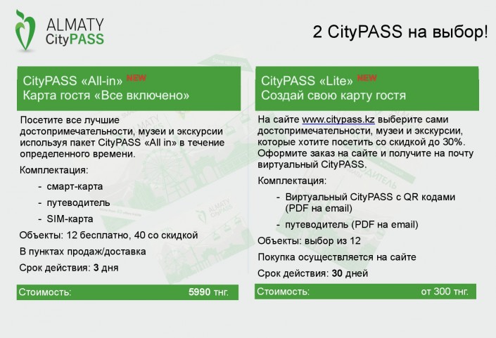 С помощью Almaty CityPASS туристы в течение трех дней смогут посетить достопримечательности, музеи и экскурсии южной столицы при этом сэкономить много времени и денег. На данный момент к карте уже подключено 12 туристических объектов Алматы. Туристы также смогут приобрести CityPASS с транспортной картой "ОНАЙ" для передвижения между объектами на общественном транспорте.