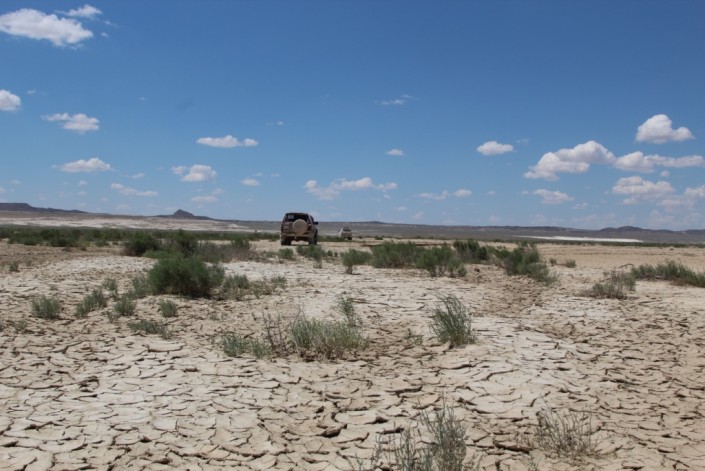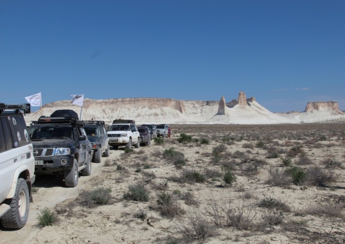 На следующий день, когда ветер стих и солнце осветило белоснежные горы, участники экспедиции повстречали одинокий внедорожник, также карабкавшийся по скалам. В таких, казалось бы, безлюдных местах, встретиться и не познакомиться - невозможно. Ведь оказавшись в дикой природе, испытываешь огромный интерес и чувство близости к таким же, как и ты, людям. В автомобиле оказалась туристка из Европы и ее гид - Сергей Хачатрян из Актау. В свободное от основной работы время он показывает достопримечательности Мангышлака иностранным туристам.