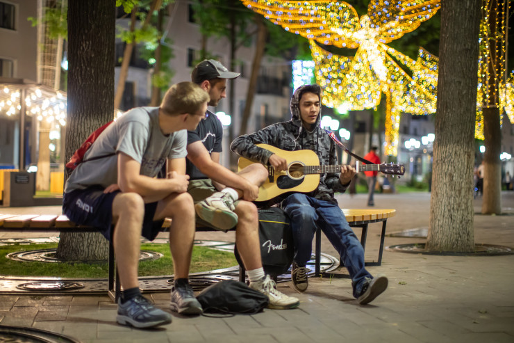 Арбат в Алматы место творческой тусовки. Тут и там музыканты играют на различных музыкальных инструментах. Вокруг них собираются толпы прохожих. Кто-то подкидывает в "шапку" денег, другие беззаботно танцуют и подпевают, третьи снимают происходящее в прямой эфир социальных сетей.