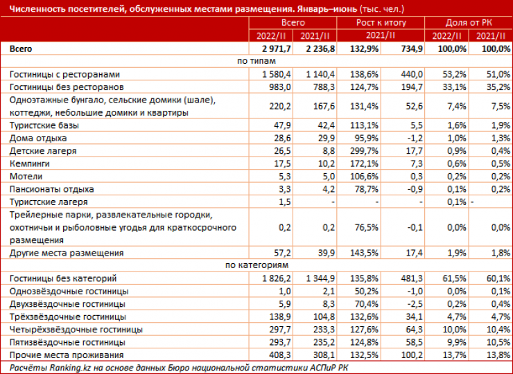 Самыми часто посещаемыми местами размещения гостей в Казахстане ожидаемо стали гостиницы с ресторанами, за первое полугодие они обслужили 1,6 миллиона человек — на 38,6 процента больше, чем годом ранее. Далее идут гостиницы без ресторанов (983 тысячи человек), а следом — коттеджи, небольшие домики, бунгало, шале и квартиры (220,2 тысячи человек). В топ-5 популярных мест размещения также вошли дома отдыха и туристские базы.