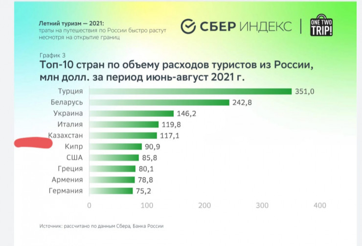 За летний период больше всего россияне потратились в Турции - 351 миллион долларов, следом идут Беларусь, Украина и Италия. На пятом месте по расходам находится Казахстан - 117,1 миллиона долларов.
