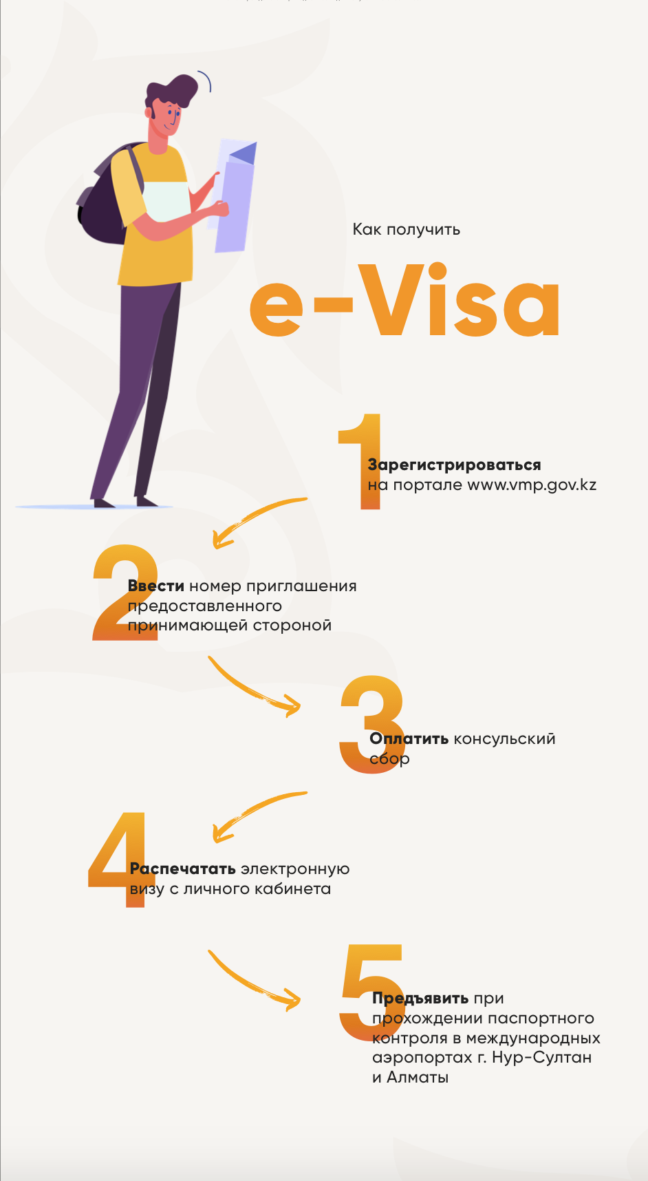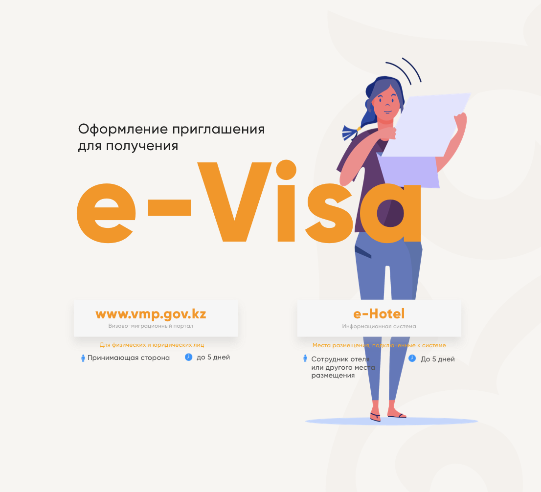 Учитывая весь негативный опыт иностранных туристов и их типичные ошибки, МВД РК в начале 2019 года провело работы по внедрению процедуры получения однократной визы (E-Visa) для иностранцев в электронном формате. Благодаря данной мере иностранные туристы из 106 государств получили возможность оформить электронно туристическую визу, граждане 17 государств - на лечение или деловую. Оформляется E-Visa на основании приглашения казахстанской стороны, оформленного в установленном порядке. Чтобы получить данное приглашение для иностранного туриста, приглашающая сторона должна подать пакет документов в соответствующие подразделения Комитета миграционной службы МВД РК. Срок рассмотрения приглашения – 5 рабочих дней, после чего приглашающей стороне будет предоставлен номер приглашения, который необходимо передать туристу для дальнейшего оформления электронной визы. Следует помнить, что документы, необходимые для оформления приглашения, напрямую зависят от того, кто выступает в качестве приглашающей стороны: частное либо юридическое лицо. Помимо этого, в случаях, предусмотренных правилами, могут запросить дополнительные документы, не указанные в первоначальном списке документов на сайте МВД или МИД РК. Туристы, имеющие действительную электронную визу, освобождаются от регистрации в органах миграционной полиции. Въезжать или выезжать из Казахстана по электронной визе возможно только через пункты пропуска международных аэропортов городов Нур-Султан и Алматы.