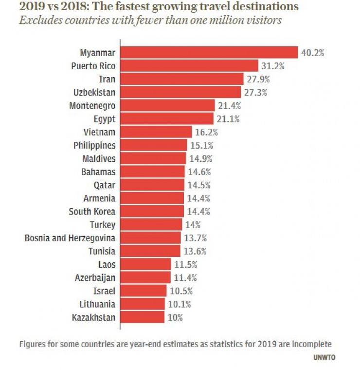 Согласно данному рейтингу, самой посещаемой страной в мире по-прежнему остается Франция. В 2019 году она приняла 89,4 миллиона человек, увеличив количество прибывающих в страну на 0,9 процента. Испания - ее ближайший конкурент, также продемонстрировала скромный рост - 1,2 процента, увеличив количество туристов с 82,8 до 83,8 миллиона человек. А что касается Китая, поток прибывающих в стране вырос на (+7,4 процента). Однако, как подчеркивает издание, ситуация может драматически измениться в 2020 году из-за коронавируса.