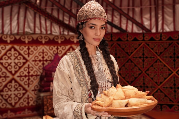 И, наконец, режиссер жестом демонстрирует, что съемки успешно завершены. Наступает момент, которого все так долго ждали. Можно отведать всех лакомств, приготовленных для съемок. Это всеми любимые бешбармак, казы, горячие баурсаки, кумыс, шубат, курт, иримшик и сорпа.