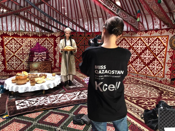 Наконец мы приехали на самые "аппетитные" съемки. Рассказ пойдет о казахской национальной кухне. "Мисс Казахстан" Мадина Батык заходит в юрту, где накрыт богатый дастархан с шубатом, казы и бешбармаком.