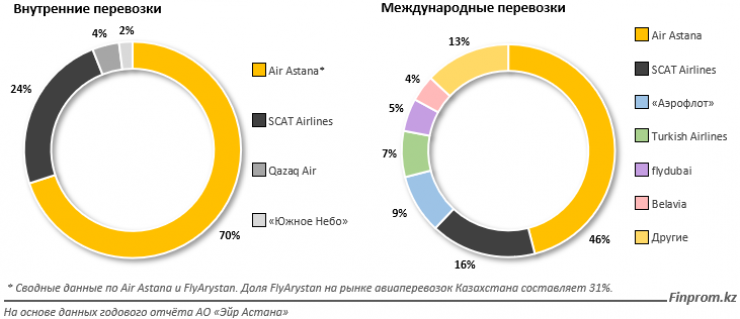 По итогам 2020 года на рынке внутренних авиаперевозок с долей в 70 процентов лидировал национальный авиаперевозчик "Эйр Астана" (в том числе 31 процент пришелся на FlyArystan). Вторую и третью строчки заняли SCAT Airlines и Qazaq Air - 24 и 4 процента соответственно. Оставшиеся 2 процента пришлись на "Южное небо".