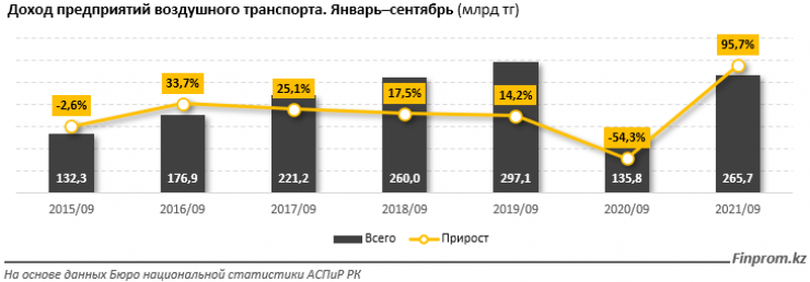 Отмечается, что в период с января по сентябрь текущего года доходы авиакомпаний выросли практически вдвое за год и достигли 252,6 миллиарда тенге только за счет пассажироперевозок. Плюс 13,1 миллиарда тенге пришлись на доходы от грузоперевозок. В 2020 году общий доход авиакомпаний составлял 135,8 миллиарда тенге. А убытки гражданской авиации составили более 350 миллиардов тенге. Однако до пандемии коронавируса, с 2016 по 2019 год, в стране наблюдался стабильный рост доходов авиакомпаний.