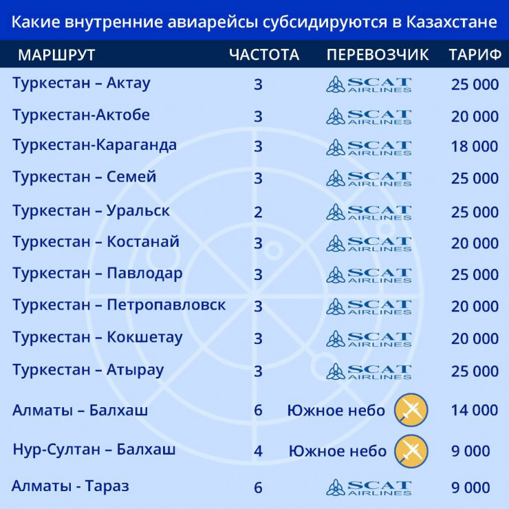 В Казахстане выделяются средства, чтобы снизить цены на авиарейсы по 23 внутренним маршрутам из следующих городов: