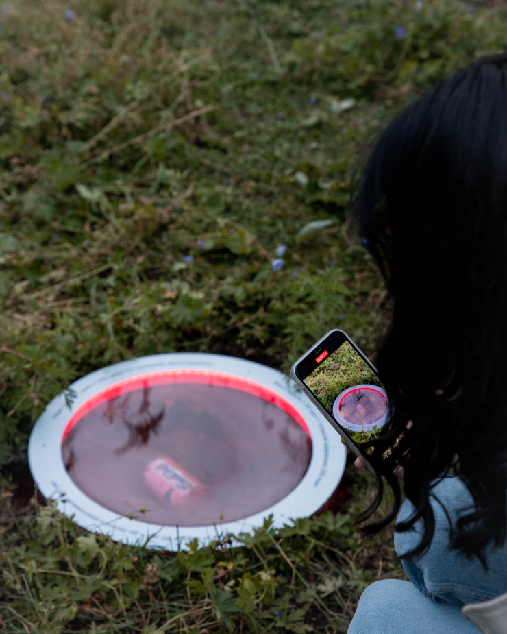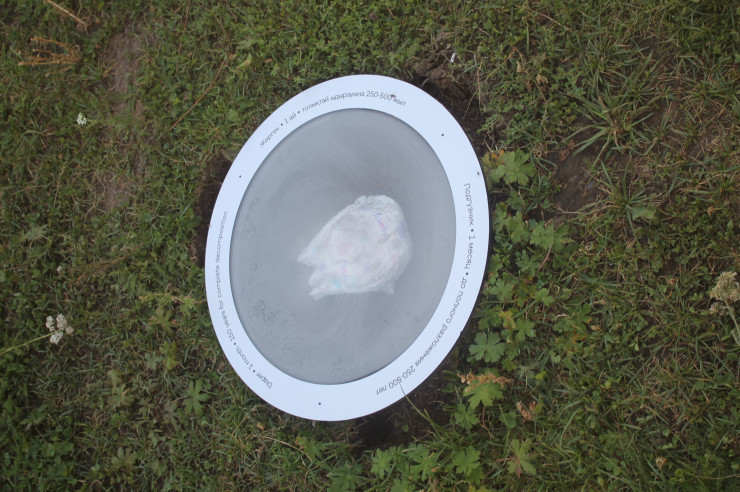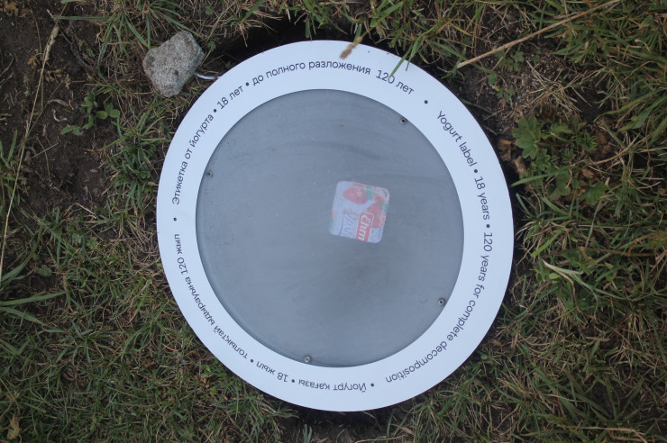 В чаши, установленные на земле, поместили мусор. Там, где могло отражаться голубое небо, лежат банки от напитков, упаковки еды, использованные памперсы и прочий мусор, найденный в окрестностях Аюсая.