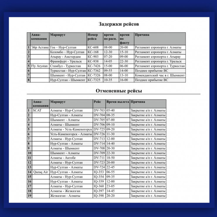 Всего 12 января 2022 года запланировано 202 рейса ("Эйр Астана" и Fly Arystan - 135, SCAT – 45, Qazaq Air – 22), из них с задержкой 8 рейсов, 96 рейсов отменено. Основные причины всех задержек и отмен рейсов – закрытие аэропорта Алматы. Авиакомпаниями "Эйр Астана" и Fly Arystan запланировано к выполнению 58 рейсов.