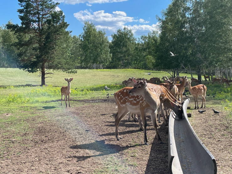 Долгим протяжным звуком лесничий кричит в сторону леса. Звук похож на тот, что издает Тарзан. Всей группой ускоряем шаг, чтобы увидеть, кто же отзовется. Из леса выбегает небольшое стадо на тонких ножках. Коричневые, почти рыжие, с белыми пятнами, маралы мчатся к кормушке, куда лесник высыпает овес. Олени принимаются за обед, и вся группа взрывается умиляющимся возгласом: "Какие красивые!"
