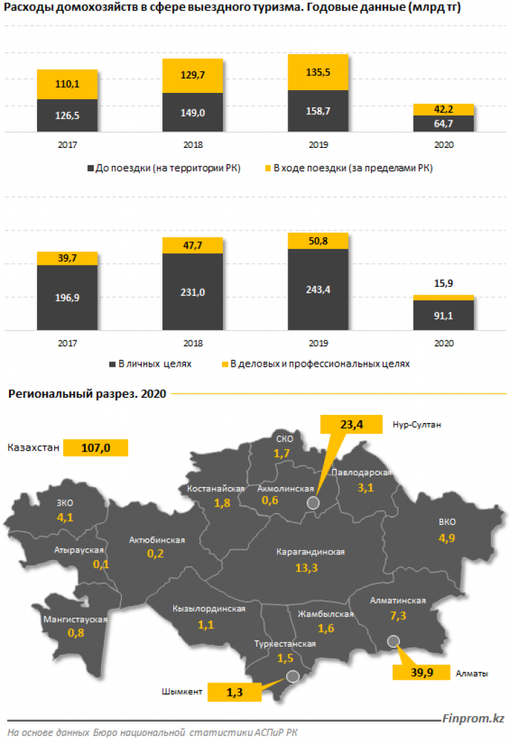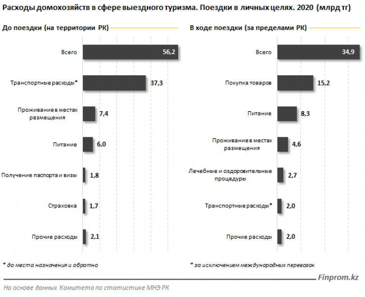 В 2020 году затраты на поездки в личных целях сократились в 2,7 раза по сравнению с 2019 годом и составили 91,1 миллиарда тенге; в деловых и профессиональных - в 3,2 раза, казахстанцы потратили на них 15,9 миллиарда тенге.