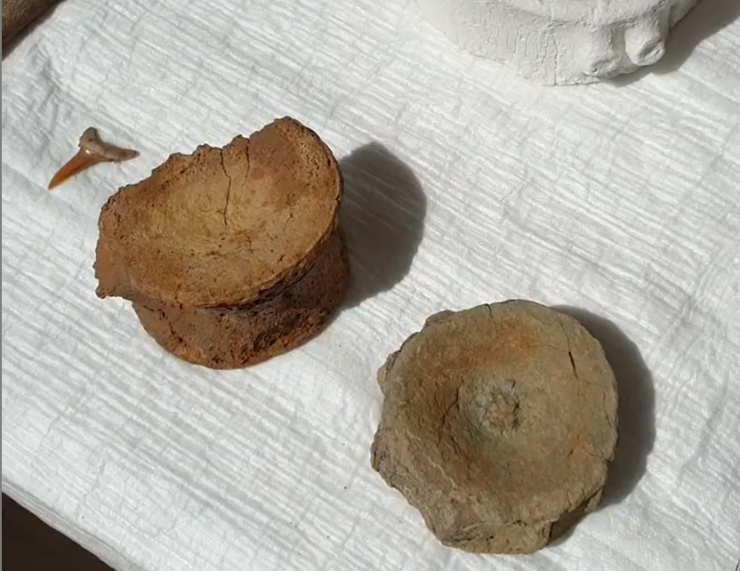 Владимир рассказывает, что такие находки встречаются повсюду в прибрежной зоне и некоторые из них - государственного уровня. Однажды, в конце мая 2019 года, Владимир нашел позвонки скелета ихтиозавра. Очень крупной особи. По оценке профессионального палеонтолога, длина его была 12-13 метров. Сейчас он в музее Актау. Также находил фрагменты скелета и зубы палеогенового дельфина, меченосной рыбы. Много мелких находок - зубы, аммониты, фрагменты скелетов ископаемых животных.