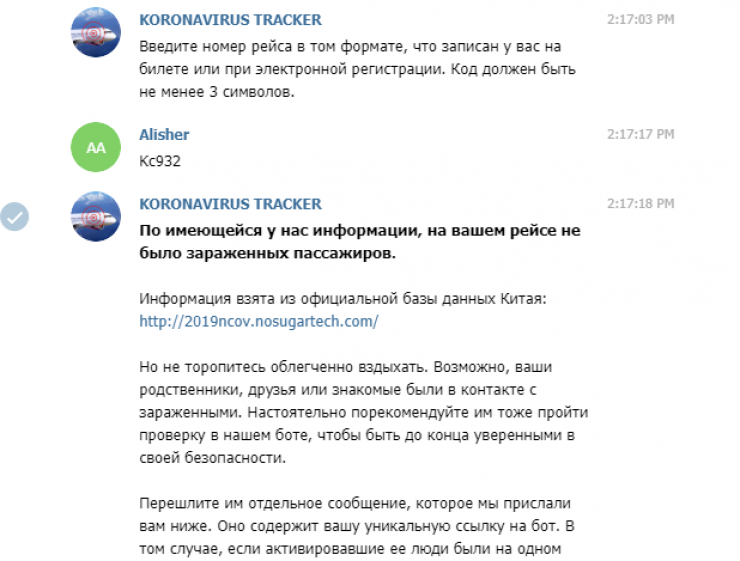 В мессенджере Telegram появился специальный бот, предназначенный для получения информации о наличии зараженных коронавирусом на авиарейсах, сообщает Tengritravel.kz.
