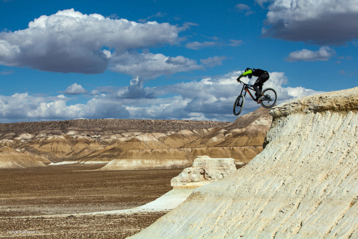 "Это были совершенно разные по формату поездки, от комфортных съемок в байк-парках Словакии, Австрии, Италии или Красной Поляне до экспедиций в Северном Приэльбрусье или Абхазии. Но такого длительного автотрипа и жизни в дикой природе, как сейчас на плато Устюрт в Западном Казахстане, у нас еще не было. У нас было довольно плотное расписание - для съемок оставалось всего 6 дней, и самым трудоемким моментом был поиск хорошего рельефа для катания, погода и освещение. Невыносимо яркий свет делал любые съемки до двух часов практически невозможными. Дневная температура достигала 42 градусов по Цельсию. Вот он, сентябрь в пустыне!" - поделился впечатлениями Петр Винокуров.