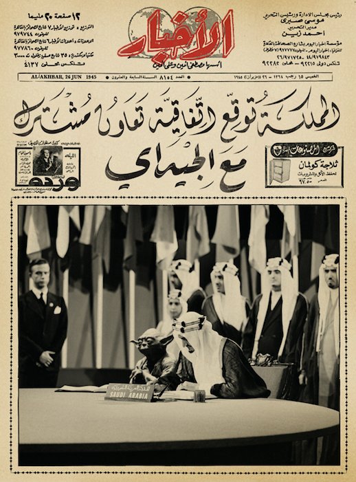На фотографии в учебнике Йода сидит за столом рядом с королем в тот момент, когда тот подписывает устав ООН в 1945 году. Фейсал бен Абдель Азиз правил Саудовской Аравией в течение 11 лет и провел немало преобразований в королевстве, в частности основал его правовую систему.