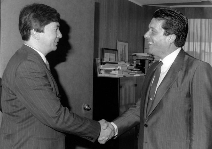 Совместное фото Токаева и Генерального директора ЮНЕСКО Федерико Майора после церемонии подписания акта о вступлении Казахстана в ЮНЕСКО 22 мая 1992 года.