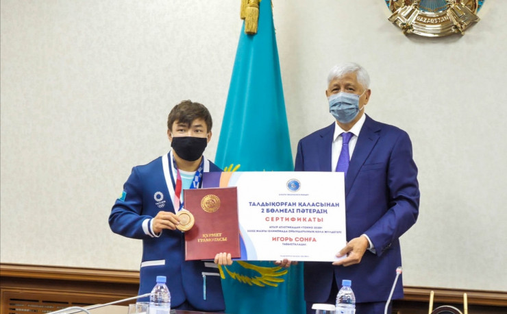 Аким Алматинской области Амандык Баталов встретился с бронзовыми призерами летних Олимпийских игр в Токио - трехкратной чемпионкой мира по тяжелой атлетике Зульфией Чиншанло и тяжелоатлетом Игорем Соном.