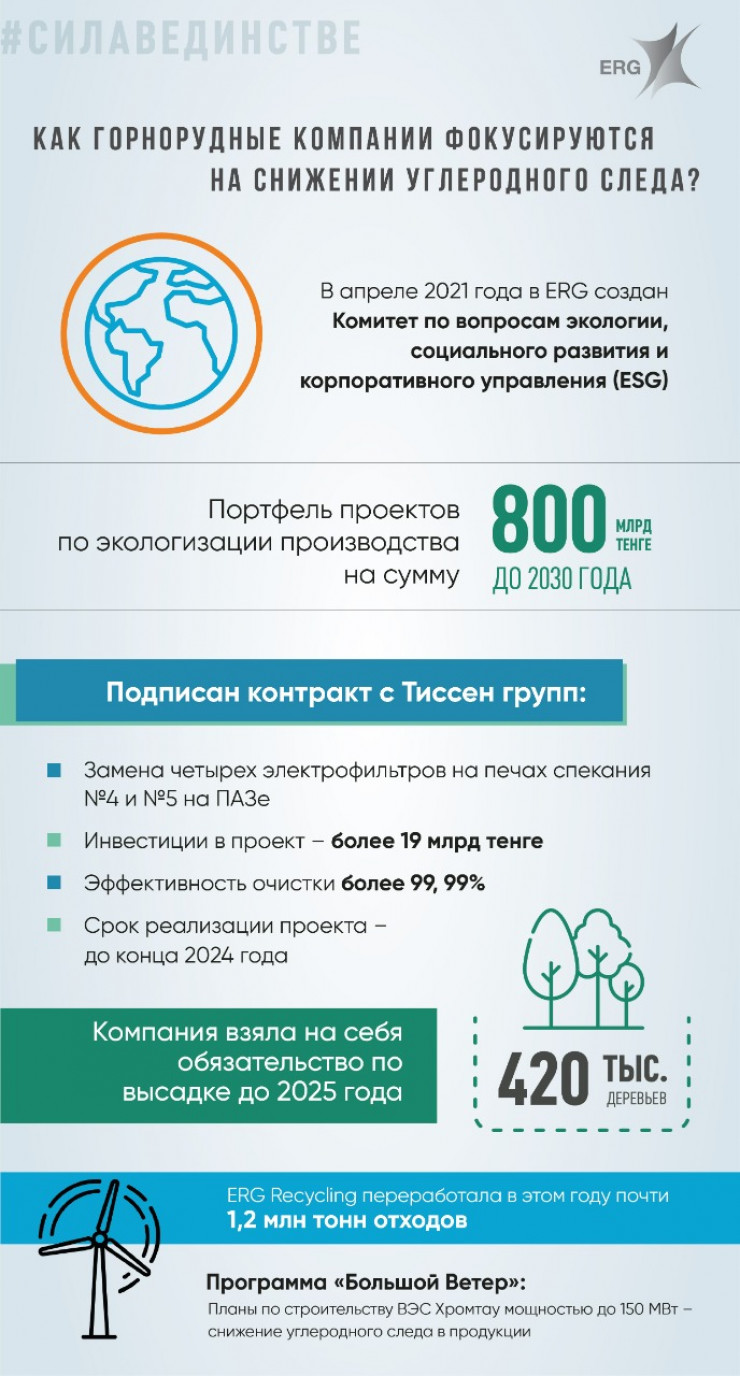 "С момента начала своей деятельности ERG брала на себя высокие социальные обязательства перед сотрудниками, регионами и страной. И мы поддерживаем политику Президента Касым-Жомарта Токаева по повышению социальной ответственности крупного бизнеса перед народом Казахстана. Несмотря на сложности, связанные с пандемией коронавируса, мы продолжили внедрять принципы устойчивого развития в свою деятельность. Глава государства в своем выступлении подчеркнул важность продолжения этой работы в условиях усиления требований ESG. Группа предпринимает активные шаги в этом направлении. Еще в прошлом году в компании был создан Комитет по вопросам экологии, социального развития и корпоративного управления (ESG). Сформирован портфель проектов по экологизации производства на сумму порядка 800 миллиардов тенге", - отметил председатель совета директоров ERG Александр Машкевич.