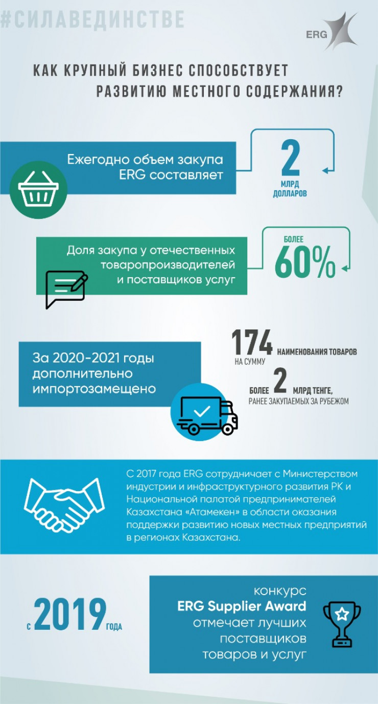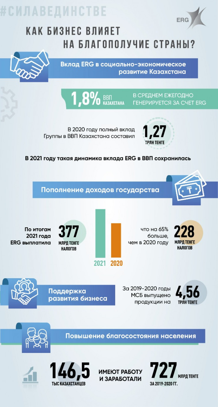 Своей деятельностью группа оказывает поддержку развитию бизнеса во всех регионах присутствия. Только за 2019-2020 годы при поддержке ERG бизнес выпустил продукции на 4,56 триллиона тенге.