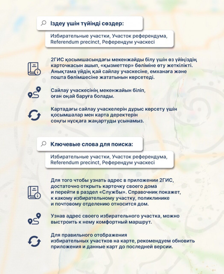 Проект реализован акиматом Алматы совместно с сервисами 2ГИС и Yandex Maps. Для удобства жителей города в картах приложений появилась возможность определения локации собственного участка. Ключевые слова для поиска: "Референдум учаскесі", "Избирательные участки", "Участок референдума", Referendum precinct.
