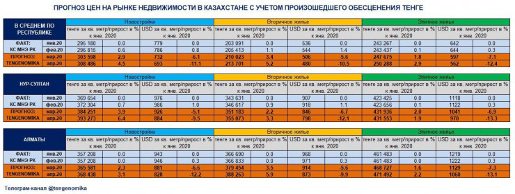 "Так, при новом сформировавшемся курсе тенге в среднем по республике новое жилье по итогам апреля (к январю 2020 года) подорожает на 4,5 процента (до 308 486 тенге за квадратный метр), а "вторичка" - на 5,2 процента (до 213 701 тенге за квадратный метр). При этом ввиду того, что произошедший размер обесценения тенге превышает ожидаемый рост тенговых цен на недвижимость, цены на все виды жилья в долларовом эквиваленте в марте-апреле продемонстрируют снижение на 10-12 процентов к январю 2020 года", - отмечают эксперты.