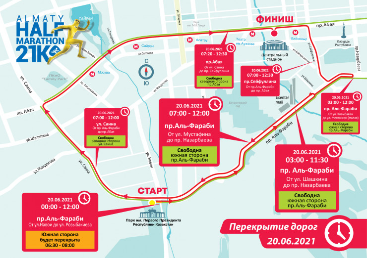20 июня на время проведения Алматинского полумарафона с 00.00 до 12.30 будет частично перекрыто движение на дорогах в местах прохождения дистанции полумарафона.