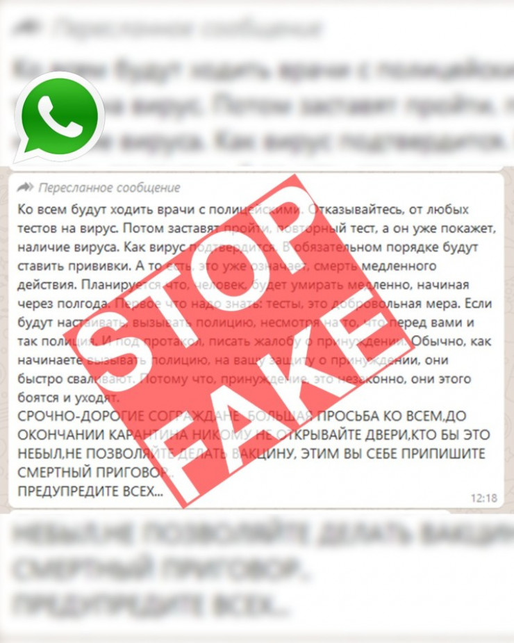 В социальных сетях и мессенджерах распространяется информация следующего характера: "Ко всем будут ходить врачи с полицейскими. Отказывайтесь от любых тестов на вирус. Это не тест, а заражение. Потом заставят пройти повторный тест, а он уже покажет наличие вируса. Как вирус подтвердится - в обязательном порядке будут принуждать вакцинироваться! В вакцине наночип и не ослабленный мутаген вируса! Это уже означает смерть медленного действия. Срочно - дорогие сограждане, обращаюсь ко всем, до окончания карантина никому не открывайте двери, кто бы это ни был, не позволяйте делать вакцину, этим вы себе подпишите смертный приговор…" - говорится в тексте фейковой информации.