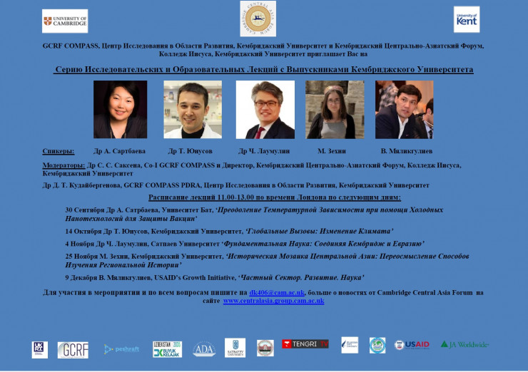 GCRF COMPASS Cambridge представляет интерактивные сессии для вовлечения местных сообществ от ведущих специалистов и исследователей Кембриджского университета, которые также являются выходцами из Центрально-Азиатского региона. Лекторами этих сессий специально выбраны представители Казахстана, Кыргызстана, Узбекистана, Таджикистана и Туркменистана, которые являются выпускниками Кембриджского университета и занимают ведущие позиции в инновационных исследованиях в экономике, политике, социальных, физических и биологических науках.