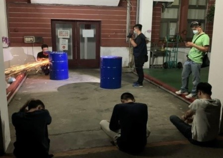 На третий день к складу на грузовом транспорте наконец прибыли двое мужчин. Проверив содержимое бочек, они загрузили их в машину и при выезде из склада были задержаны силовиками.
