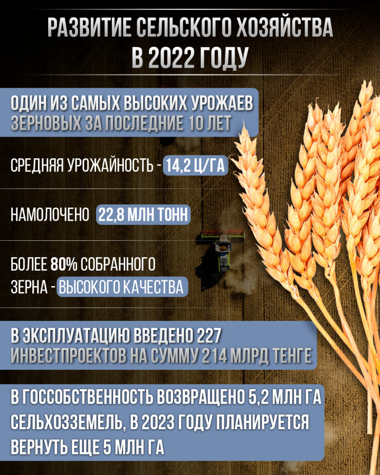 В 2022 году благодаря господдержке в эксплуатацию введено 227 инвестпроектов на сумму 214 миллиардов тенге, а до конца года их количество планируется довести до 237. В госсобственность возвращено 5,2 миллиона га сельхозземель, в 2023 году планируется вернуть еще 5 миллионов га. Была также продолжена реализация Комплексного плана по строительству и модернизации овощехранилищ, в рамках которого за 2021-2022 годы введено 201,1 тыс. тонн хранения (111 процентов от плана).