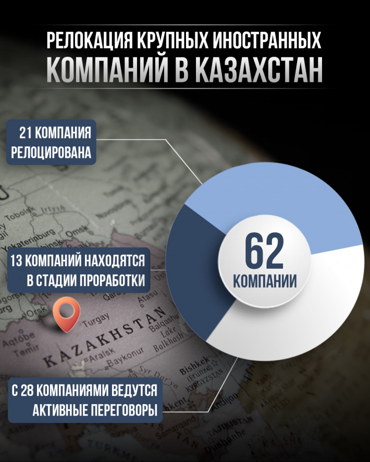 В течение года правительством также проводилась интенсивная работа по релокации ряда крупных иностранных компаний в Казахстан. По 62 из них удалось достичь конкретных результатов: 21 релоцирована, 13 находятся в проработке, еще по 28 идет активный переговорный процесс.