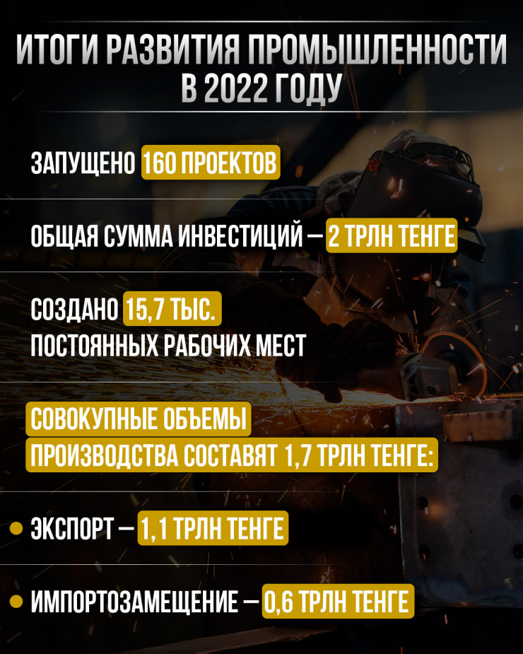 В целом при выходе на проектную мощность всех новых проектов 2022 года их совокупные объемы производства составят около 1,7 триллиона тенге, из них экспорт – 1,1 триллиона тенге, импортозамещение – 0,6 триллиона тенге.