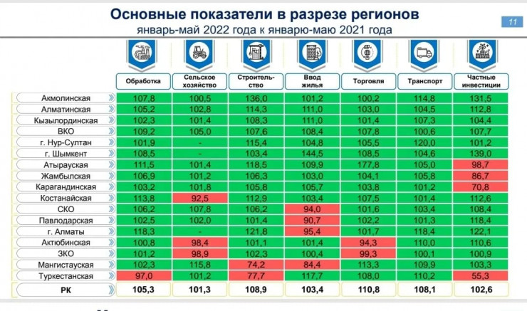 Министр отметил, что темпы роста инвестиций в основной капитал составили 2,5 процента. Инвестиции выросли на 71,7 процента в образовании, на 55,1 процента - в государственном управлении и социальном обеспечении, на 35,9 процента - в науке и технической деятельности, на 27,8 процента - в здравоохранении, на 20,4 процента - в операциях с недвижимостью, на 13,9 процента - в торговле, на 10,7 процента - в строительстве. Было отмечено, что самый высокий показатель среди регионов наблюдается в Шымкенте и Алматы, а также Акмолинской области.