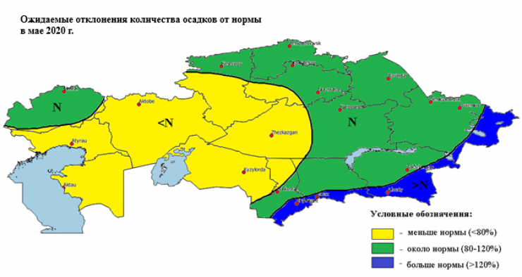 Количество осадков ожидается около нормы на большей части Казахстана, меньше нормы – в Актюбинской, Атырауской, Мангистауской, Кызылординской, на большей части Костанайской, на юго-западе Акмолинской, на западе Карагандинской, на севере Туркестанской областей, больше нормы – в горных и предгорных районах Восточно-Казахстанской, Алматинской, Жамбылской и Туркестанской областей.