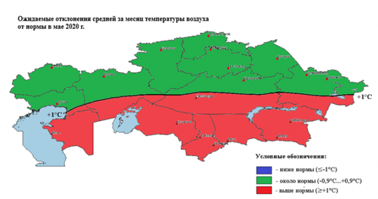 По многолетним климатическим данным, в первой половине мая заморозки обычно прекращаются в южной половине, а к концу месяца – и в северной половине Казахстана. В мае этого года понижение температуры воздуха в ночные часы до заморозков не исключено в северо-восточных регионах, в горных и предгорных районах юго-востока страны.