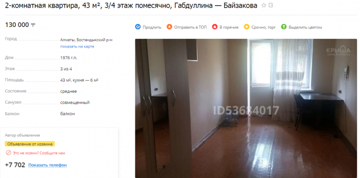 Двухкомнатная в Алматы. Дом 1976 года постройки. Скриншот с сайта "Крыша".