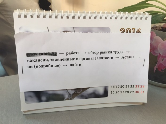 40 минут ожидания и на табло появился мой номер. После всех официальных заполнений вам выдается направление на работу по желаемой вакансии. Также вы заполняете анкету соискателя. В бланке можно указать о включении вас в группу в мессенджере WhatsApp. Актуальные вакансии можно найти и на сайте enbek.kz. Инструкцию по поиску в Сети специалист посоветовала сфотографировать, чтобы было понятно и доступно.