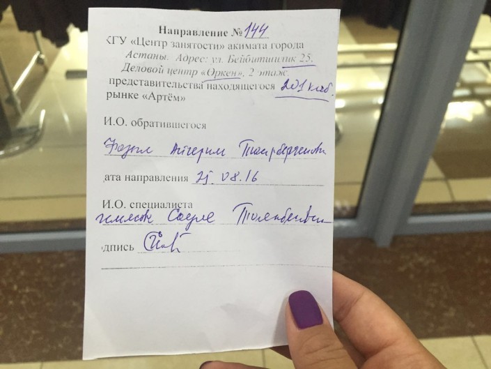 В Центре занятости мне подсказали номер офиса. 2 этаж, 86 бутик. Приняла меня сотрудница по имени Сауле. Ознакомившись в стопке таблиц с вакансиями, женщина записала нужную информацию в лист направления. Хочется отметить доброту Сауле. Человек, который наверняка получает не очень большую зарплату как психолог, выслушала меня, поддержала, поговорила. Далее сотрудница, вручив направление, отправила меня в Центр занятости на Бейбитшилик, 25.