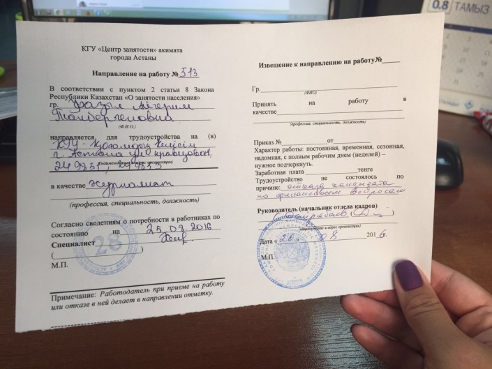 На руках у меня было два направления: 1) офис-менеджер с окладом в 100 тысяч тенге; 2) журналист без опыта работы в КГУ (коммунальное государственное учреждение). Я выбрала второе. Позвонив по указанному номеру, договорилась на собеседование. Приехав раньше оговоренного времени, увидела в кабинете девушку, которая также ищет работу. Если в моем случае это был эксперимент, то молодая девушка реально искала работу. В этот момент мне стало немного стыдно. Человек ищет заработок, а я, по сути, со своим репортажем могу ей помешать. Сославшись на маленькую зарплату (60-70 тысяч), я отказалась от вакансии. Графу по трудоустройству мне заполнили как "отказ кандидата по финансовым вопросам" и поставили печать. На этой ноте и закончился мой эксперимент.