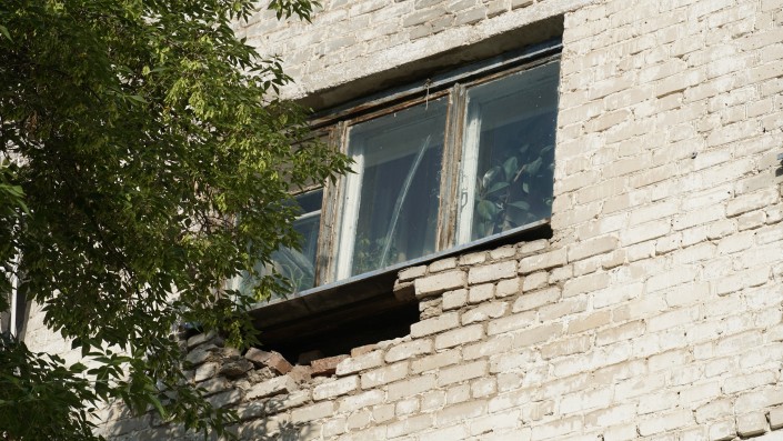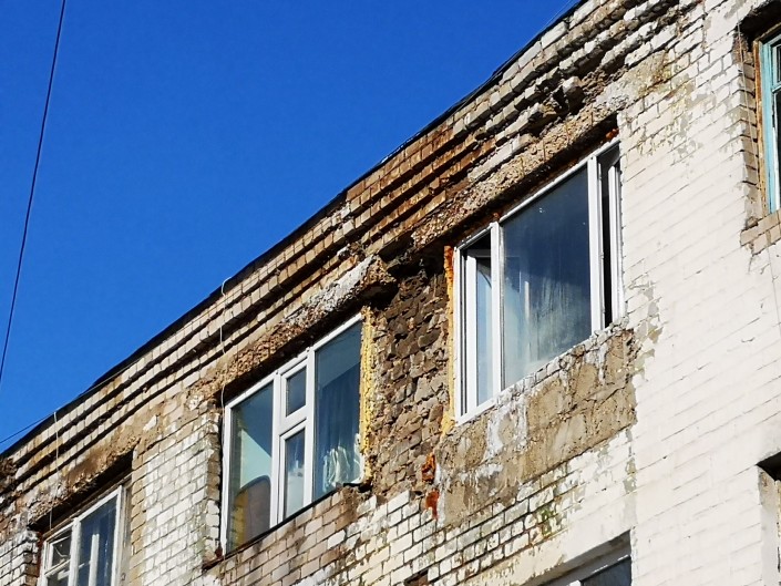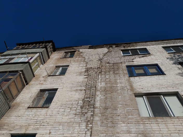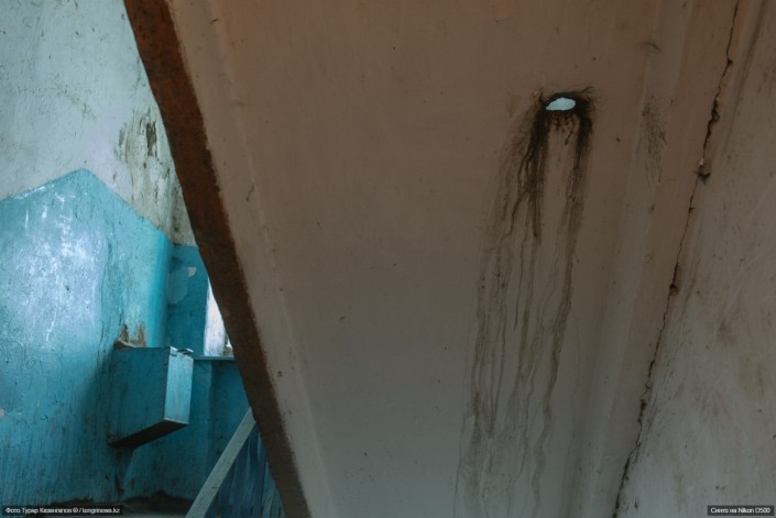 Четырехэтажный дом в столице Казахстана выглядит запущенным. Верхние этажи страдают от сырости. С уличной стороны периодически обваливается кирпичная кладка.
