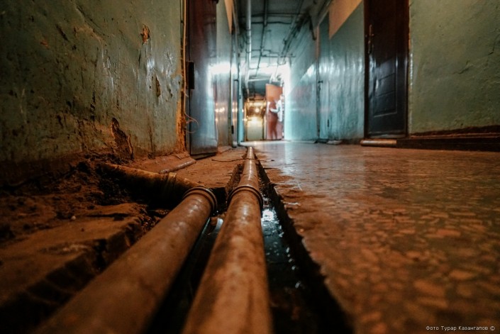 В темном коридоре общежития бросается в глаза нагромождение труб. От них исходит характерное журчание. По трубам ползет таракан.