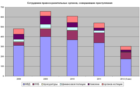 3. Большинство преступлений среди сотрудников правоохранительных органов совершают представители МВД, затем КНБ, потом органов юстиции. Меньше всего преступлений совершают сотрудники прокуратуры, финансовой полиции и судьи;