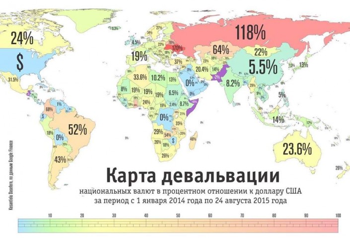 Вы, наверное, уже видели эту карту. Помимо явного лидерства Казахстана в падении тенге, эта карта должна нести чисто терапевтический эффект. Дескать, не только мы склонили голову перед великим и ужасным американским долларом.
