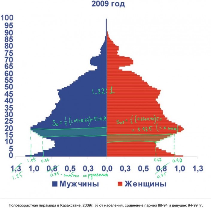 Согласно результатам переписи населения 2009 года, в Казахстане проживало 7,712 миллиона мужчин и 8,297 миллиона женщин, то есть соотношение женщин к мужчинам было больше: 107 к 100, благо уже не 10 к 1, но, возможно, это все же аргумент в пользу тех, кто считает, что женщин в бракосозидательном возрасте больше. Давайте заглянем глубже. Зная, что при рождении 107:100 в пользу мальчиков, очень трудно поверить, что уже в бракосозидательном возрасте статистика перевернется в сторону девушек 107:100. Действительно, средняя продолжительность жизни женщин в Казахстане на десять лет больше: 75 против 65, поэтому можно предположить, что основная разница в соотношении приходится на последние годы жизни. Подумайте сами, как много у нас апашек-вдов.