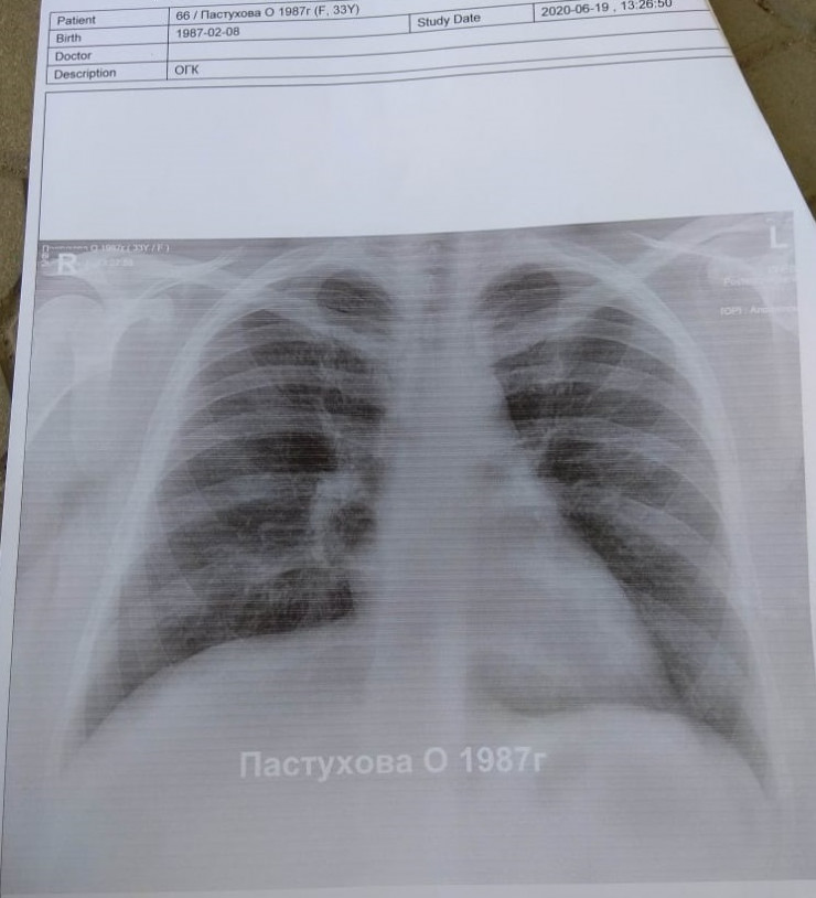 Одно хорошо: у меня муж - врач. Когда 19 июня у меня начался сильный кашель, он настоял, чтобы я сходила на рентген. Я шла по улице в маске и за версту обходила мам с младенцами на руках, не дай бог заразить кого-то! Рентген показал, что у меня бронхит. Правду говорят: "У страха глаза велики". Я, начитавшись про "матовое стекло", спрашиваю со слезами на глазах: "А что это за затемнение в левой части снимка? Легкое поражено?" Муж смеется: "Это сердце".