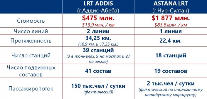 Вместе с тем не до конца раскрытой осталась тема того, насколько может быть завышена стоимость "Aстана LRT" по сравнению с его реальной стоимостью? Для предположений по этому вопросу есть аналогичный проект LRT ADDIS, который был реализован в Эфиопии в 2015 году тем же самым китайским подрядчиком. Прилагаем сравнительную таблицу основных параметров проекта.