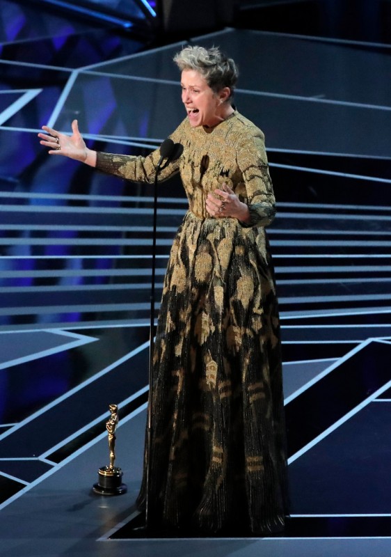 Завоевавшая награду в номинации "Лучшая женская роль" исполнительница главной роли в драме "Три билборда на границе Эббинга, Миссури" Фрэнсис Макдорманд. Минимум косметики и закрытое платье с золотыми элементами - вот в чем блистала актриса.