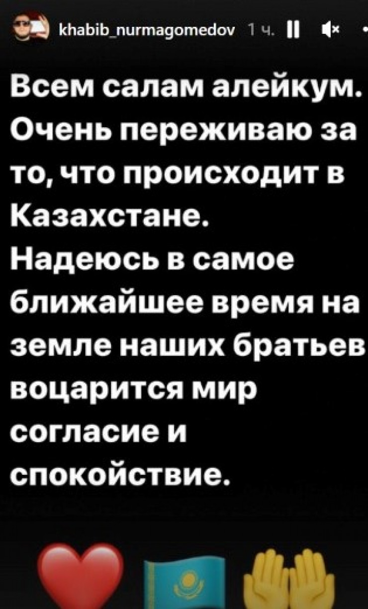 "Всем салам алейкум. Очень переживаю за то, что происходит в Казахстане. Надеюсь, в самое ближайшее время на земле наших братьев воцарится мир, согласие и спокойствие", - написал Нурмагомедов.
